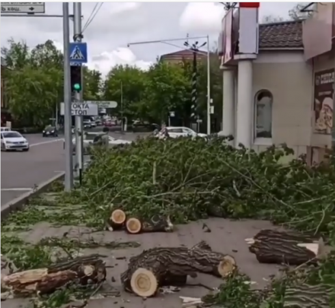 В Караганде дерево, упавшее на дорогу, спилили для обеспечения безопасности движения
