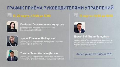 График приёма граждан руководителями управлений в марте на сайте акимата Карагандинской области.