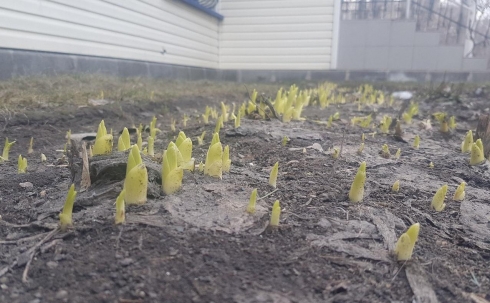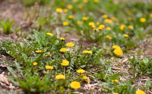Первые в этом году Маленькая желтая полянка одуванчиков в одном из темных дворов Караганды. Фото Алисы ВОЙТАШЕНКО